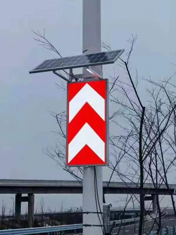 太阳能诱导标志是以单晶硅太阳能电池组件为能源,它利用太阳能电池板将白天的阳光转换成电能贮存于蓄电池中,当夜幕降临、视线昏暗或雨雾天气等视线不佳情况下,线性诱导标志牌上的发光二极管自动启动闪烁,通过LED发出亮光来勾画图案轮廓,传达交通信息。主动发光线性标志发出的光线特别明亮、醒目,具有强烈的警示作用。
